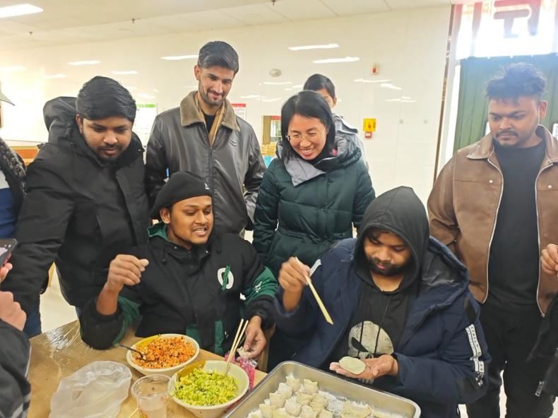 活动现场欢声笑语、暖意融融,大家一起包饺子,话祝福,褚夫敏详细询问留学生们的假期生活、学业进展和饮食起居,关切地叮嘱大家注意假期安全,合理规划时光,鼓励他们充分利用春节契机,多体验中国年俗、多感受中华优秀传统文化的魅力。通过本次活动,留学生不仅增进了对中国传统文化的了解,也搭建起了中外文化交流的桥梁。
